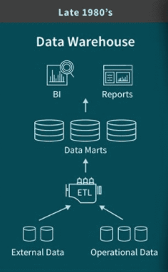 A década de 80 e a primeira década do século XXI corresponde ao período de ascensão e predomínio do Data Warehousing (DW) que correspondem a sistemas usados para relatórios e análise de dados (para simplificar, adotaremos a sigla DW deste ponto em diante).