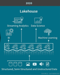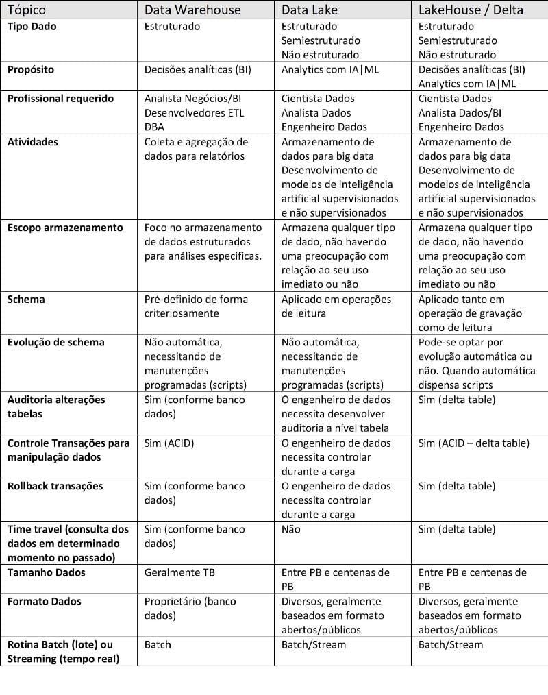 Estas capacidades “perdidas” poderiam ser novamente adotadas com o LakeHouse, apresentando características combinadas do Data Lake (formato de dados aberto, armazenamento e processamento paralelo) e do DW (controle transações, governança, qualidade dados).