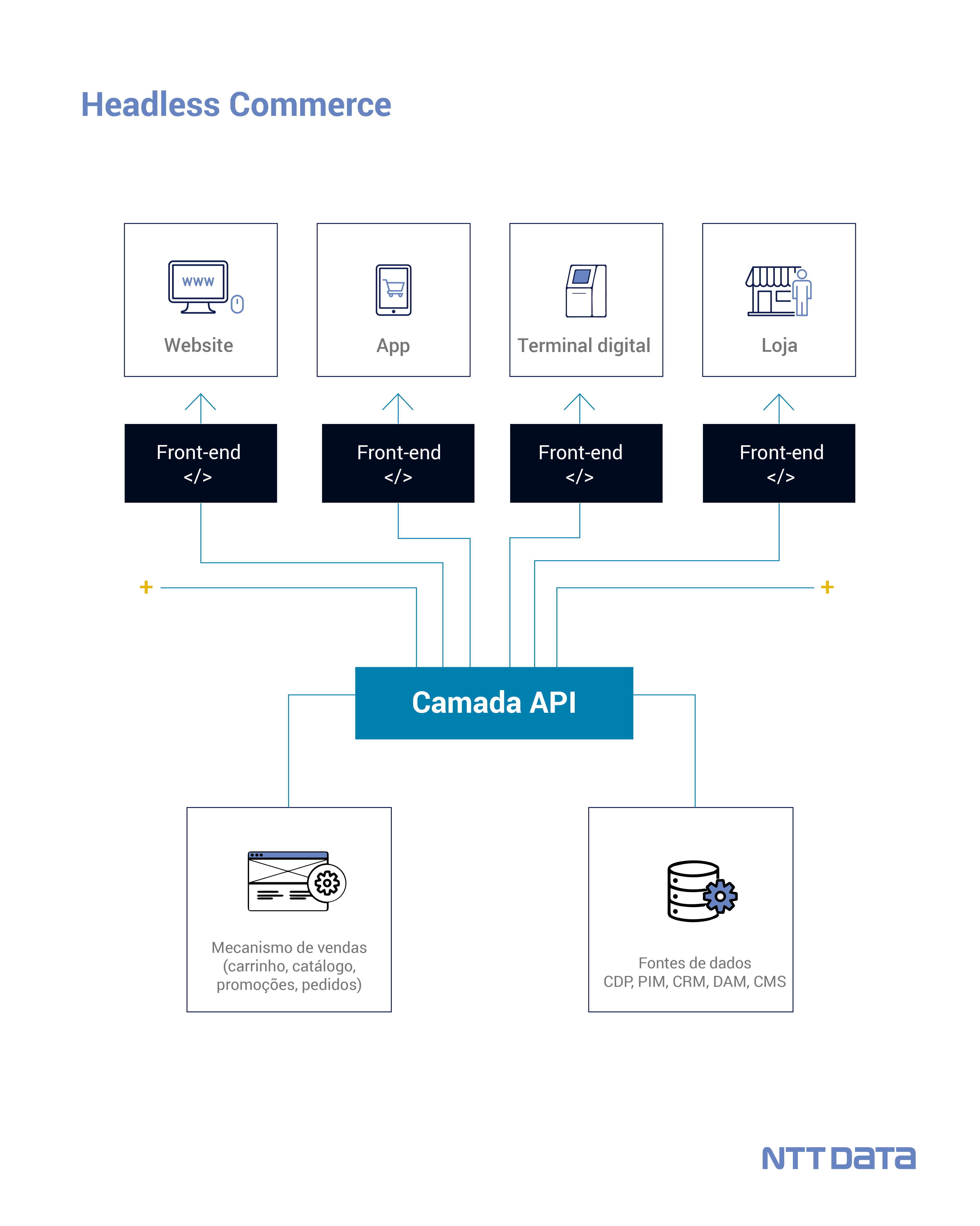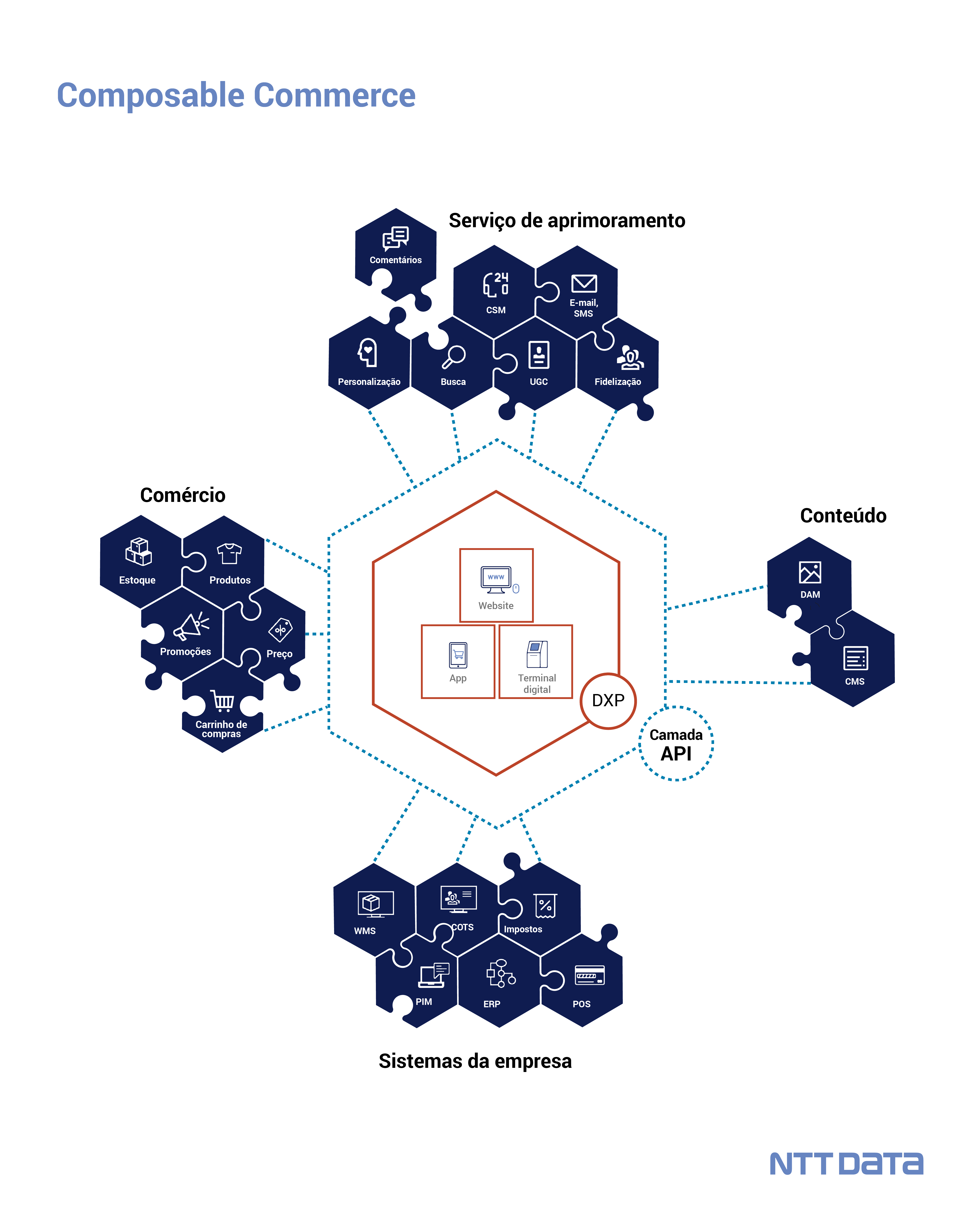 O uso do composable commerce permite que as empresas se adaptem às futuras tendências em um ecossistema digital. O Digital Commerce Hub da NTT DATA conta com o suporte de uma equipe de especialistas com uma visão global, que permite que as organizações migrem para essa arquitetura imediatamente, porém, é recomendável desenvolver um plano detalhado e avançar gradativamente, incorporando as funcionalidades individuais etapa por etapa.
